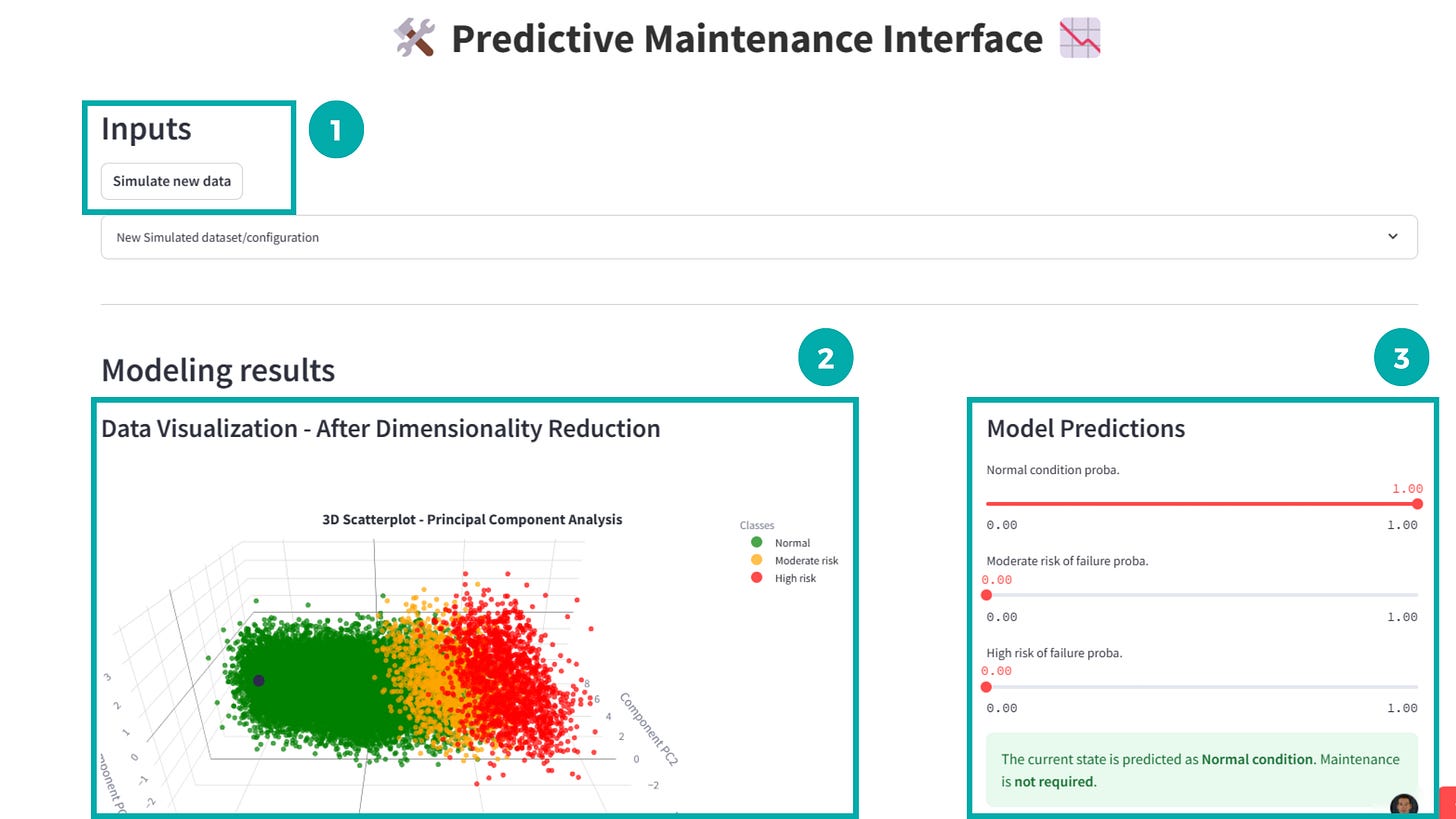 For each new configuration, the app displays the probabilities for each risk level, along with clear maintenance action recommendations.